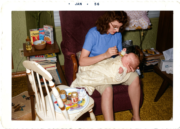 I scanned in this photo the other day. It was taken in January of 1956 and it shows me at age 1½ months being fed by my mom.